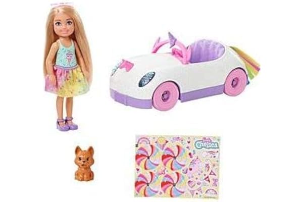 Home »Unlabelled » Barbie Club Chelsea Doll (6-inch Blonde) with Open-Top Rainbow Unicorn-Themed Car, Pet Puppy, Sticker Sheet & Accessories, Gift for 3 to 7 Year Olds