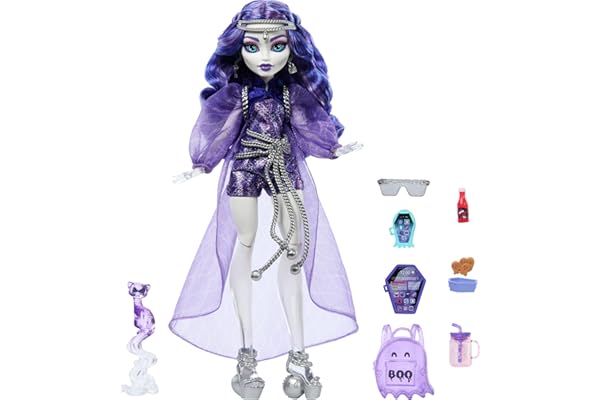 #1:Monster High Spectra Vondergeist Doll with Pet Ferret Rhuen and Accessories Like Backpack, Tablet, Snacks and More
